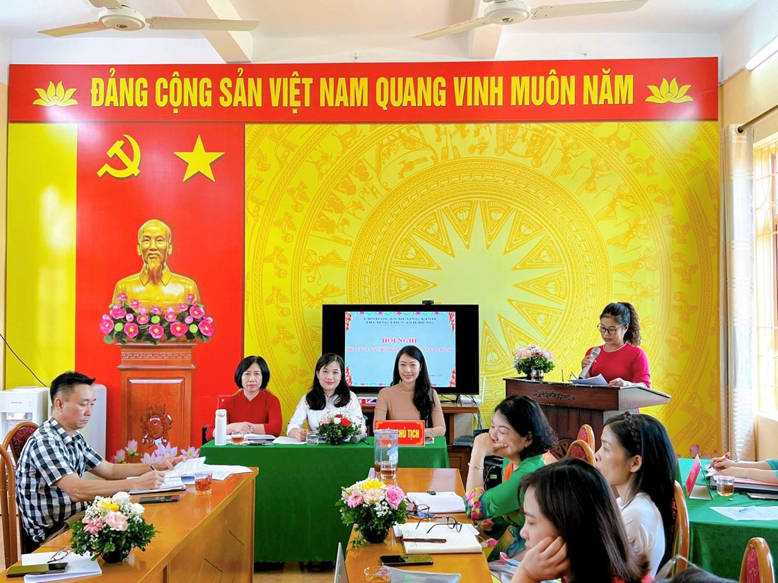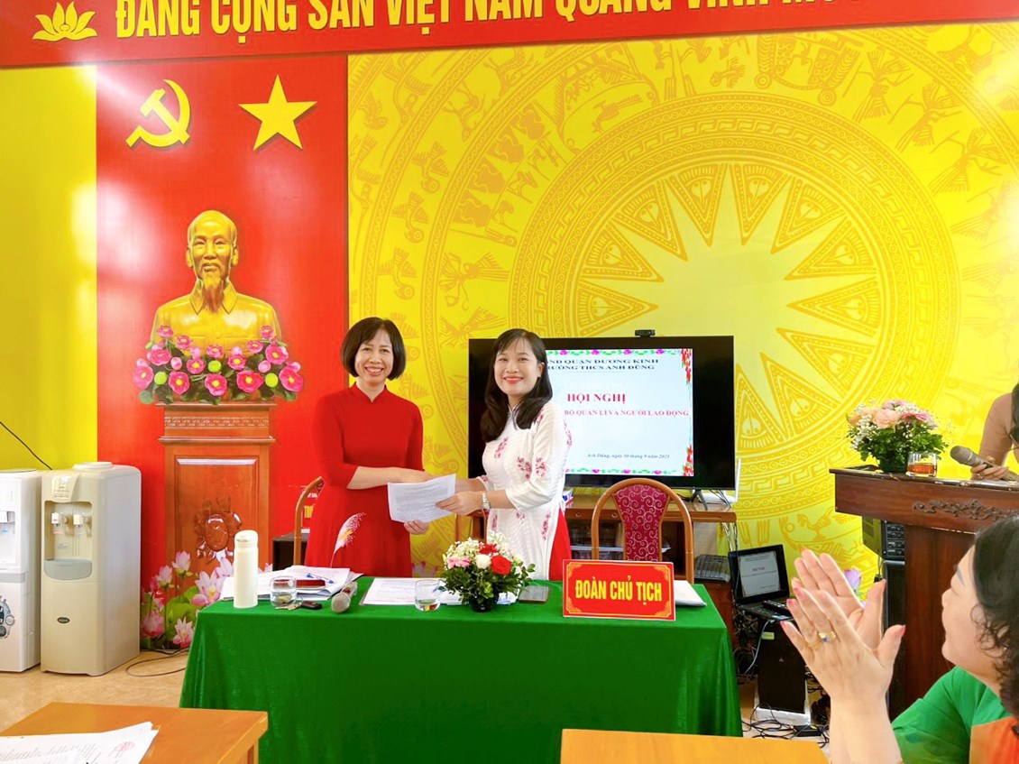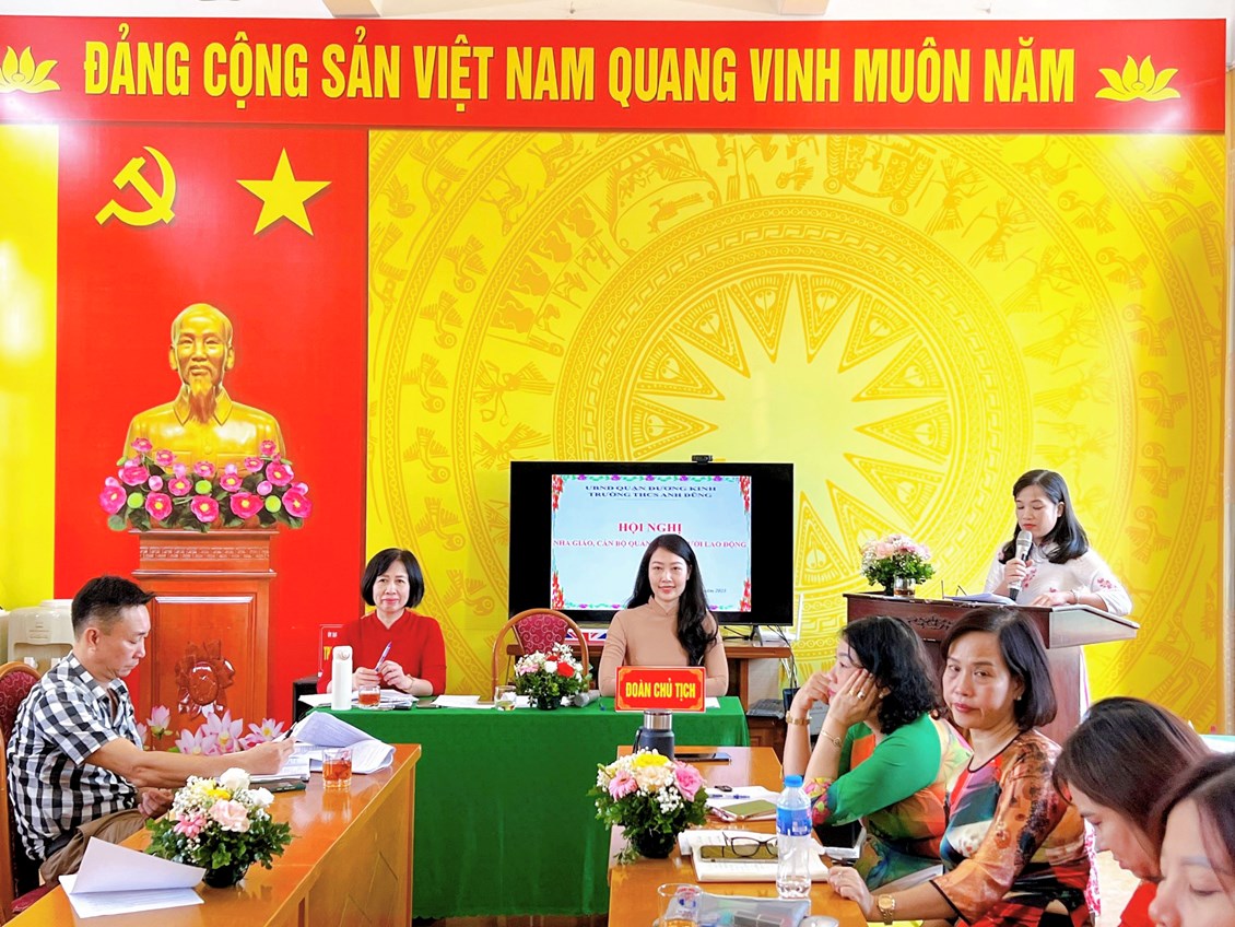 Ngày 30/09/2023 trường THCS Anh Dũng đã tổ chức Hội nghị nhà giáo, cán bộ quản lý và người lao động năm học 2023-2024. Hội nghị đã nghe báo cáo kết quả thực hiện nhiệm vụ của nhà trường năm 2022-2023; phương hướng nhiệm vụ năm học 2023- 2024 do bà Lê Thị Thanh Thảo- Bí thư Chi bộ- Hiệu trưởng nhà trường trình bày. Bà Nguyễn Thị Thu Hằng- Chủ tịch Công đoàn trường trình bày báo cáo kết quả phong trào thi đua công đoàn năm học 2022-2023 và đăng ký danh hiệu thi đua năm học 2023-2024 do; báo cáo hoạt động của Ban Thanh tra nhân dân. Hội nghị đã thảo luận và nghe ý kiến đóng góp của cán bộ, giáo viên bàn các giải pháp thực hiện nhiệm vụ của nhà trường năm học tới, có 02 ý kiến đã tham gia tại hội nghị. Hiệu trưởng đã tiếp thu các ý kiến và giải đáp các kiến nghị của các tổ và của CBGVNV. Hội nghị kêu gọi toàn thể cán bộ, giáo viên, nhân viên tăng cường đoàn kết trên cơ sở thực hiện tốt Quy chế dân chủ trong trường học, phát huy sức mạnh, trí tuệ tập thể, tích cực hưởng ứng phong trào thi đua do Thủ trưởng cơ quan và BCH Công đoàn phát động, đề cao trách nhiệm, nghĩa vụ của cán bộ, nhà giáo, người lao động cùng nhau phấn đấu hoàn thành thắng lợi các nhiệm vụ, chỉ tiêu công tác do Hội nghị đã đề ra.