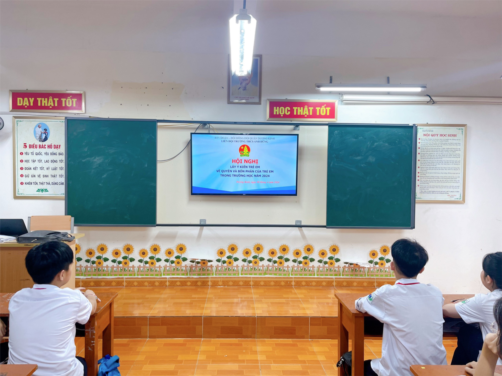 Ngày 02/04/2024, Liên đội trường THCS Anh Dũng tổ chức hoạt động “ Lấy ý kiến của trẻ em về các vấn đề liên quan đến nhà trường”, hoạt động thúc đẩy quyền tham gia của trẻ em; trẻ em được lấy ý kiến, nguyện vọng về các vấn đề trẻ em quan tâm thông qua các hoạt động của nhà trường.