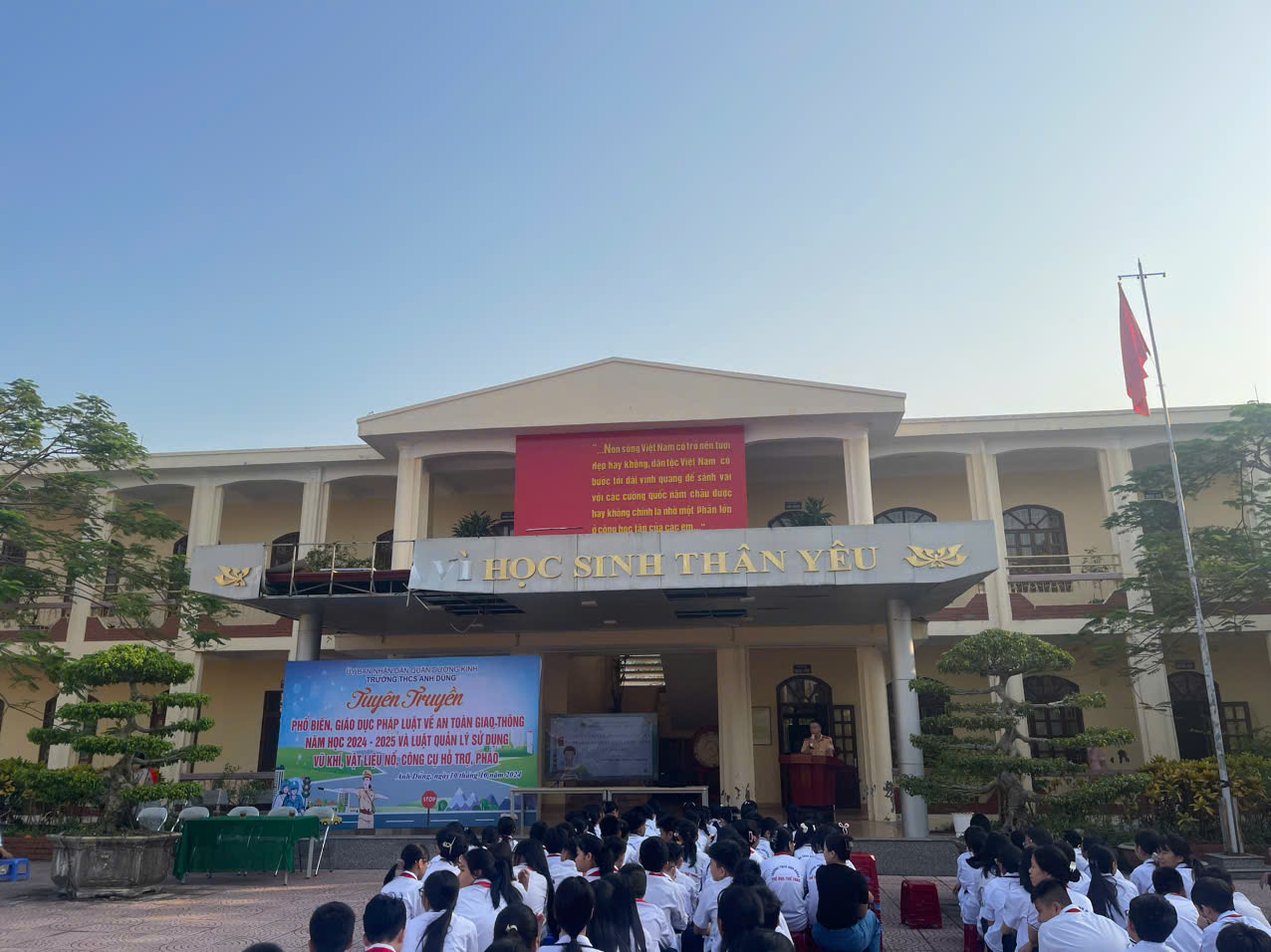 Sáng ngày 10/10/2024, Đội Cảnh sát GTTT - Công an quận Dương Kinh phối hợp tổ chức tuyên truyền, phổ biến, giáo dục pháp luật về an toàn giáo thông năm học 2023 - 3024 và luật quản lí sử dụng vũ khí, vật liệu nổ, công cụ hỗ trợ, pháo cho toàn thể giáo viên, học sinh trườngTHCS Anh Dũng.